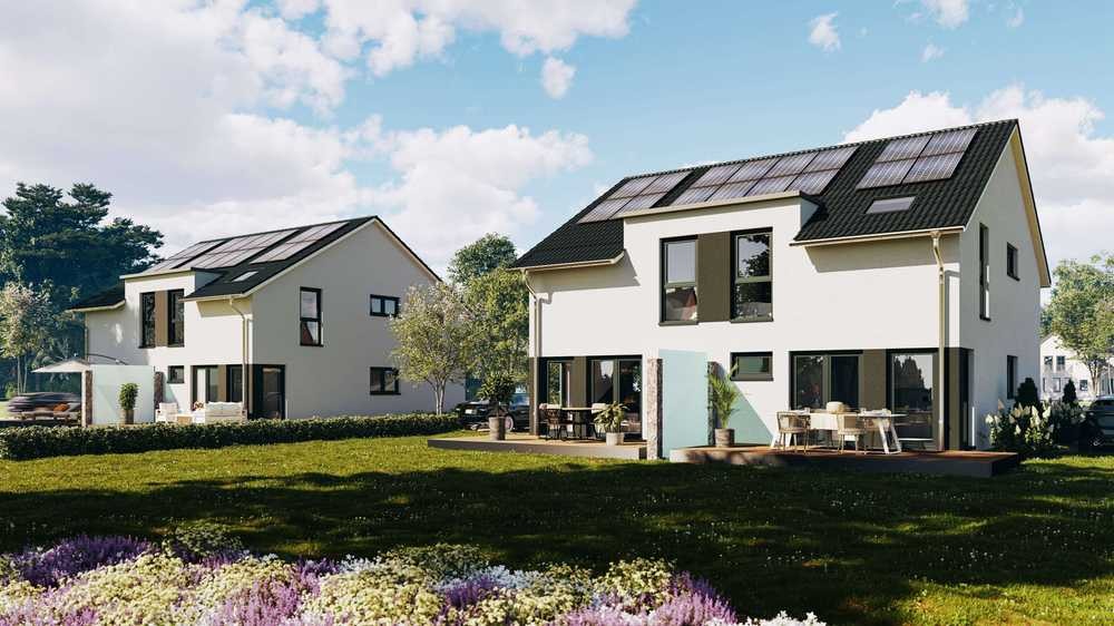 Die Hausplanung ist individuell veränderbar. Das Hausbeispiel zeigt ein Zweifamilien-Doppelhaus mit Walmdach.