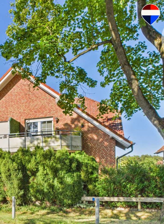 Das markante Wohngebäude befindet sich auf einem Gemeinschaftsgrundstück mit grüner Gartengestaltung.