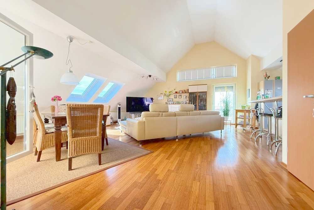 Gleich im Wohn- und Esszimmer erwartet Sie durch die ca. 4,60m hohe Decke ein tolles Raumgefühl. Direkt angeschlossen befindet sich die offen gestaltete sowie hochwertig ausgestatteten Küche, die neben aller notwendigen technischer Ausstattung, ausreichend Stell- und Arbeitsfläche bietet. Weiteres Highlight ist die gemütliche Süd-West Dachterrasse sowie der Balkon mit westlicher Ausrichtung.