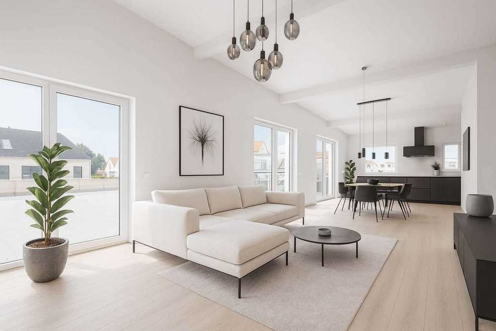 Großzügigkeit auf ganzer Linie: Der offen gestaltete Wohn- und Essbereich beeindruckt durch seine weiten Sichtachsen, ein modernes, lichtdurchflutetes Design und ein edles Zusammenspiel aus hochwertigen Materialien. Hohe Decken und eine geschmackvolle, elegante Ausstattung schaffen ein unvergleichliches Raumgefühl.