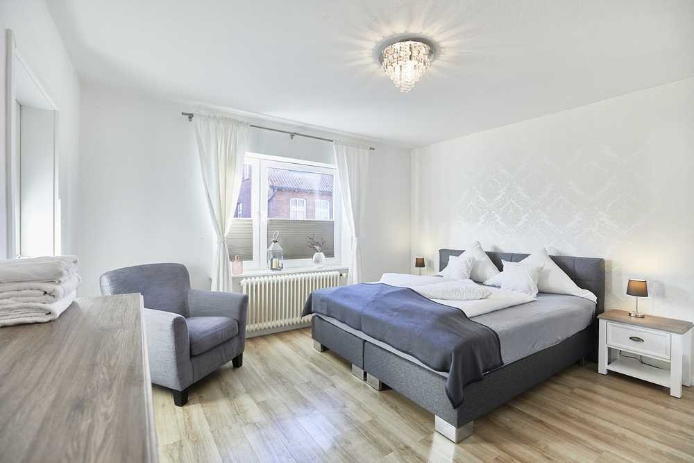 Wohnung 1: Im Erdgeschoss des Ferienhauses befindet sich die gemütliche Wohnküche mit Essplatz und TV. Weiterhin liegt auf dieser Etage ein Bad mit Dusche und WC sowie eine Waschküche mit Waschmaschine und Trockner. Im Obergeschoss liegen die drei Schlafräume mit Doppelbetten für jeweils 2 Personen. Einem der Schlafzimmer schließt sich ein zusätzlicher Wohnraum mit TV an sowie das große Badezimmer mit Dusche, WC, Waschbecken und Fenster.