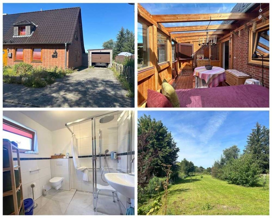 Beim Betreten des Hauses empfängt Sie ein großzügig geschnittenes Wohnzimmer, das mit einem Kaminofen ausgestattet ist, der nicht nur wohlige Wärme spendet, sondern auch den gemütlichen Charme des Hauses unterstreicht. Der Wohnbereich führt direkt in den Essbereich, der an die Küche angrenzt. Die Küche ist mit einer maßgefertigten Einbauküche aus Holz ausgestattet und bietet direkten Zugang sowohl zum Wintergarten als auch zum Badezimmer. Das Duschbad, das 2024 saniert wurde, ist hell gefliest und verfügt über ein Fenster. Es ist mit einer barrierefreien Dusche, WC, Waschbecken und einem Handtuchhalterheizkörper ausgestattet. Hinter dem Badezimmer liegt ein praktischer Hauswirtschaftsraum, der ausreichend Platz für die Waschmaschine, die Heizungsanlage und weitere Geräte bietet. Der Bereich von Esszimmer, Küche und Badezimmer ist mit einer Fußbodenerwärmung ausgestattet. Der ca. 12,35 m² große Wintergarten bietet einen traumhaften Blick in den liebevoll gestalteten Garten. Dieser lädt nicht nur zum Gärtnern und Entspannen ein, sondern verfügt auch über einen Geräteschuppen. Vom Garten aus gibt es einen überdachten Zugang zur Garage. Diese lässt sich praktischerweise beidseitig öffnen. Das vollständig umzäunte Grundstück bietet viel Platz zum Spielen für Kinder und Vierbeiner.