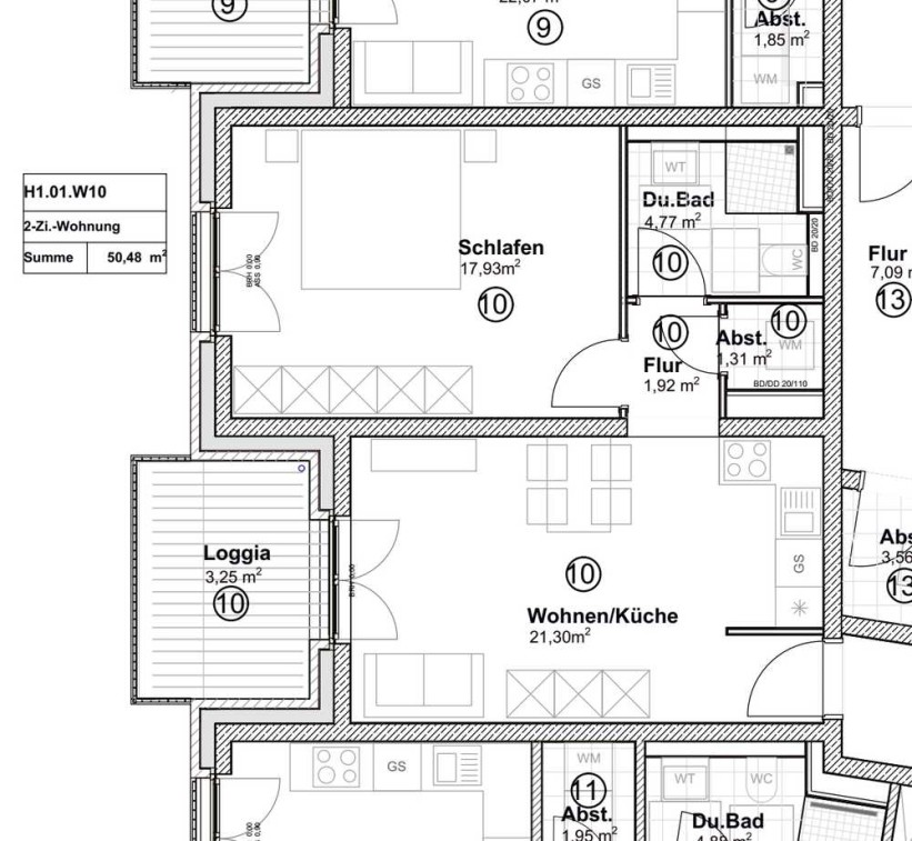 Das Angebot bezieht sich auf die Wohnung 10 im 1. Obergeschoß im Baufeld 2 b. Von der zentralen Diele mit Garderobe gelangen Sie in den hellen Wohn/Eßbereich mit offener Küche von ca. 23 m² mit Ausgang auf die schöne Loggia von ca. 7 m². Gleichermaßen sind der geräumige Schlafraum von 18 m², das Duschbad von ca. 5 m² sowie der Abstellraum von der Diele erreichbar. Die Wohnung hat eine Wohnfläche von ca. 50 m². Der Wohnung ist ein Kellerraum zugeordnet.