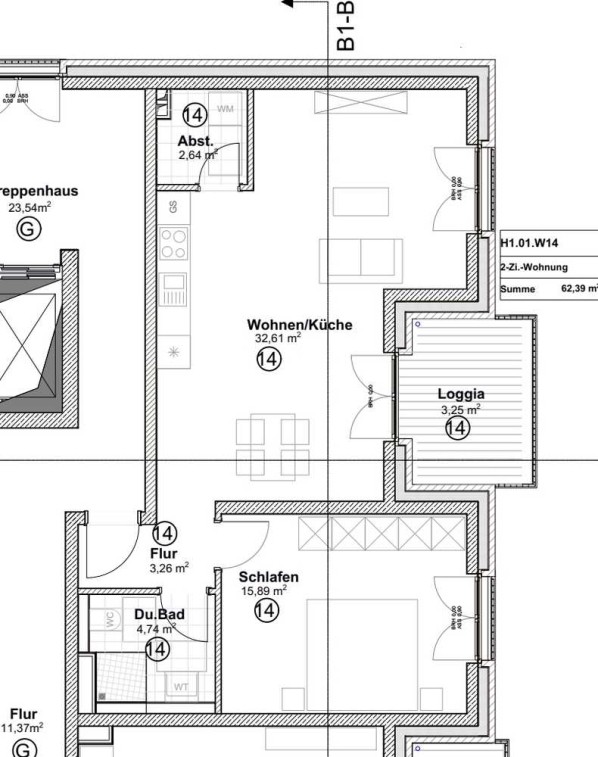 Das Angebot bezieht sich auf die Wohnung 14 im 1. Obergeschoß im Baufeld 2 b. Von der zentralen Diele mit Garderobe gelangen Sie in den hellen Wohn/Eßbereich mit offener Küche von ca. 33 m² mit Ausgang auf die schöne Loggia von ca. 7 m². Gleichermaßen sind der geräumige Schlafraum von 16 m², der Abstellraum sowie das Duschbad von ca. 5 m² von der Diele erreichbar. Die Wohnung hat eine Wohnfläche von ca. 64 m². Der Wohnung ist ein Kellerraum zugeordnet.