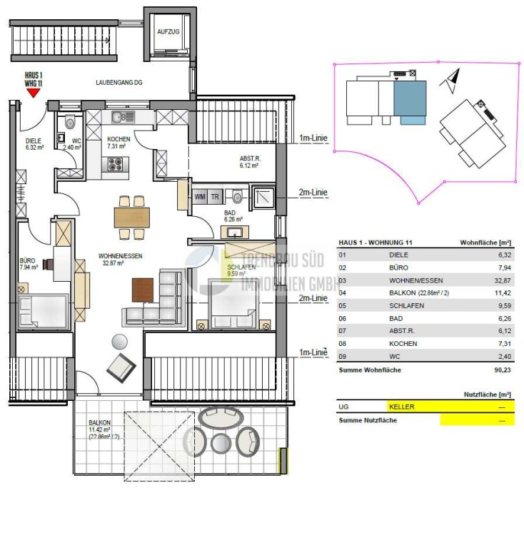 Willkommen in Ihrem neuen Zuhause in Mietingen! Es entstehen zwei moderne Mehrfamilienhäuser mit insgesamt 19 hochwertigen Wohnungen, die durch eine gemeinschaftliche Tiefgaragenanlage miteinander verbunden sind. Die Gebäude sind barrierefrei vom Untergeschoss bis ins Dachgeschoss dank eines Aufzugs, der allen Wohnungen zugänglich ist. Jede Wohnung verfügt über einen eigenen Kellerabstellraum im Untergeschoss, der im Kaufpreis enthalten ist. Zusätzlich zum Erwerb stehen jeweils zwei Stellplätze (Tiefgaragenstellplatz 27.000,- € / Außenstellplatz 9.000,- €) pro Wohnung zur Verfügung, um Ihren Komfort zu maximieren.