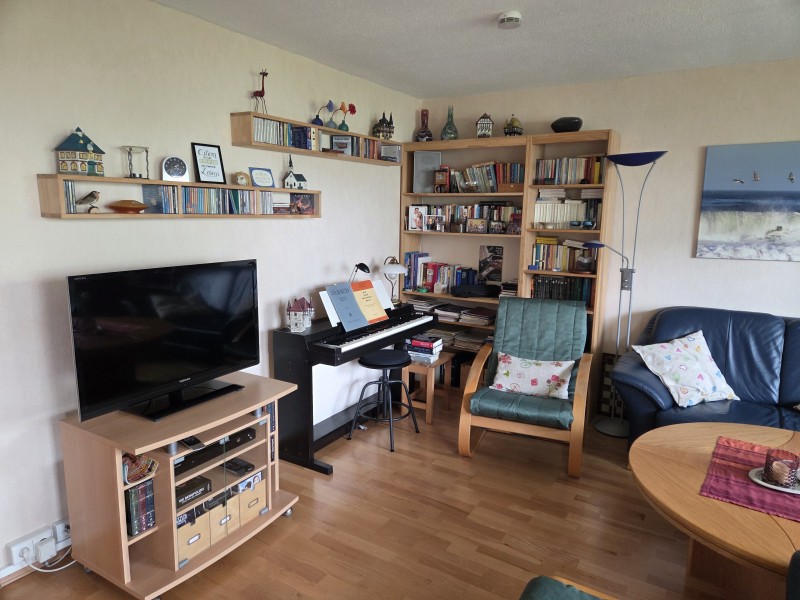 Schöne Wohnung im Hochparterre eines 6-Parteien-Hauses mit unterschiedlich großen Wohnungen; großer Garten um das Haus; sehr ruhige Lage in 2. Reihe abseits der Durchgangsstraßen, im Sommer dank Balkonüberdachung angenehm kühl, im Winter bei direkter Sonneneinstrahlung hell und warm