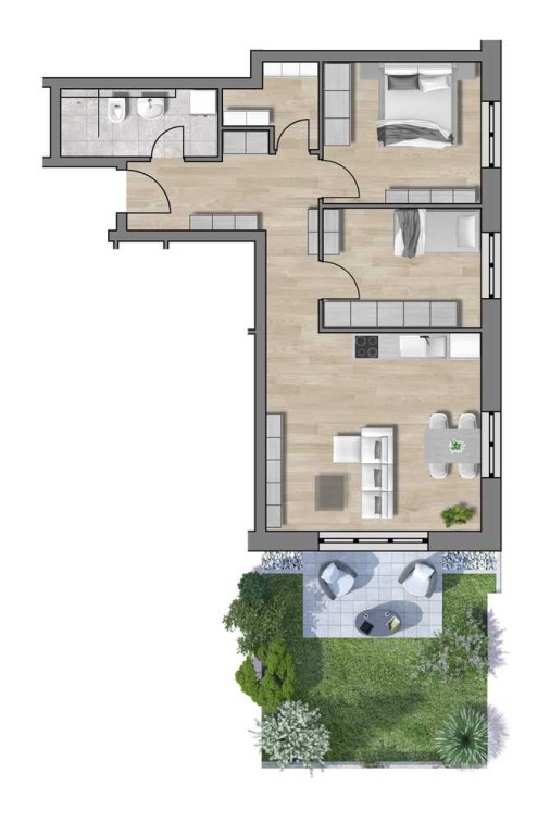 Einladende Balkone im Obergeschoss laden zum Verweilen ein, während die Erdgeschosswohnungen mit landschaftsarchitektonisch gestalteten Gartenanteilen ein besonderes Maß an Privatsphäre bieten.