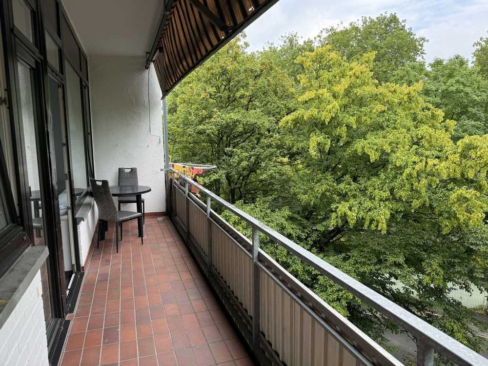 Der großzügige Balkon verläuft über die gesamte Wohnung und eröffnet Ihnen eine herrliche Aussicht auf den begrünten Innenhof – ein perfekter Ort für entspannte Stunden im Freien. Die vorhandene Markise ist in die Jahre gekommen und könnte nach Ihren individuellen Wünschen erneuert werden.