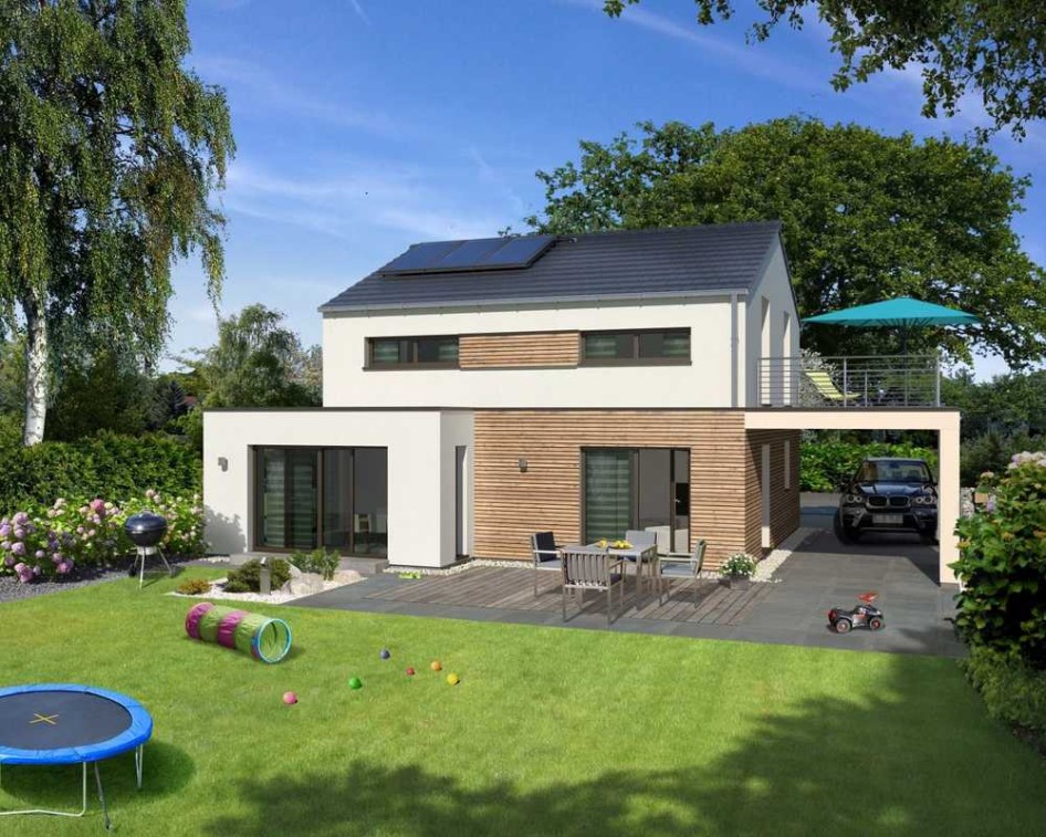 Das Einfamilienhaus ist modern und elegant in der Architektur. Auf dem Dach des Carports entsteht ein großzügiger Balkon für die Räume im Obergeschoss. Durch den erhöhten Kniestock ergibt sich für die Räume im Obergeschoss eine bessere Nutzung der Stellfläche und Bewegungsfläche. Der Grundriss des Energiesparhauses bietet im Erdgeschoss einen großzügigen Wohn-/Essbereich mit einer offenen Küchengestaltung.
