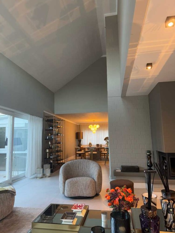 Nicht nur die offene Gestaltung des Wohnbereichs mit gemütlichem Kamin sorgt für ausreichend Lebensgefühl, sondern auch die bodentiefen Fensterfronten, die für Helligkeit und Wohlgefühl sorgen.