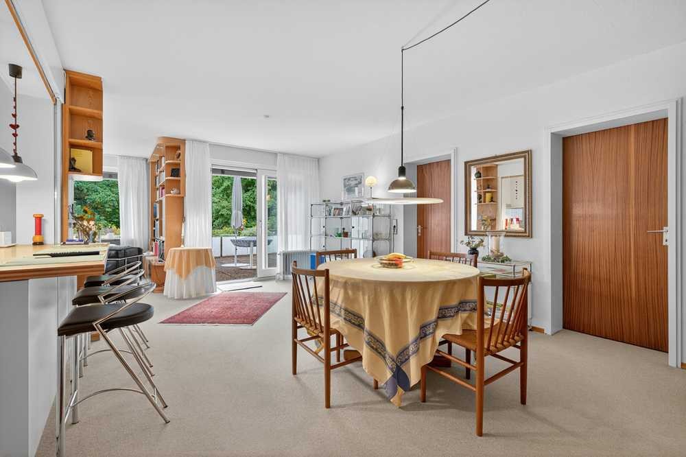 Herzstück der Wohnung ist der offene Wohn- und Essbereich, der durch seine Helligkeit und Großzügigkeit überzeugt. Die angrenzende Küche ist mit einer offenen Durchreiche zum Essbereich ausgestattet, was den Raum zusätzlich auflockert und für kommunikatives Kochen sorgt.