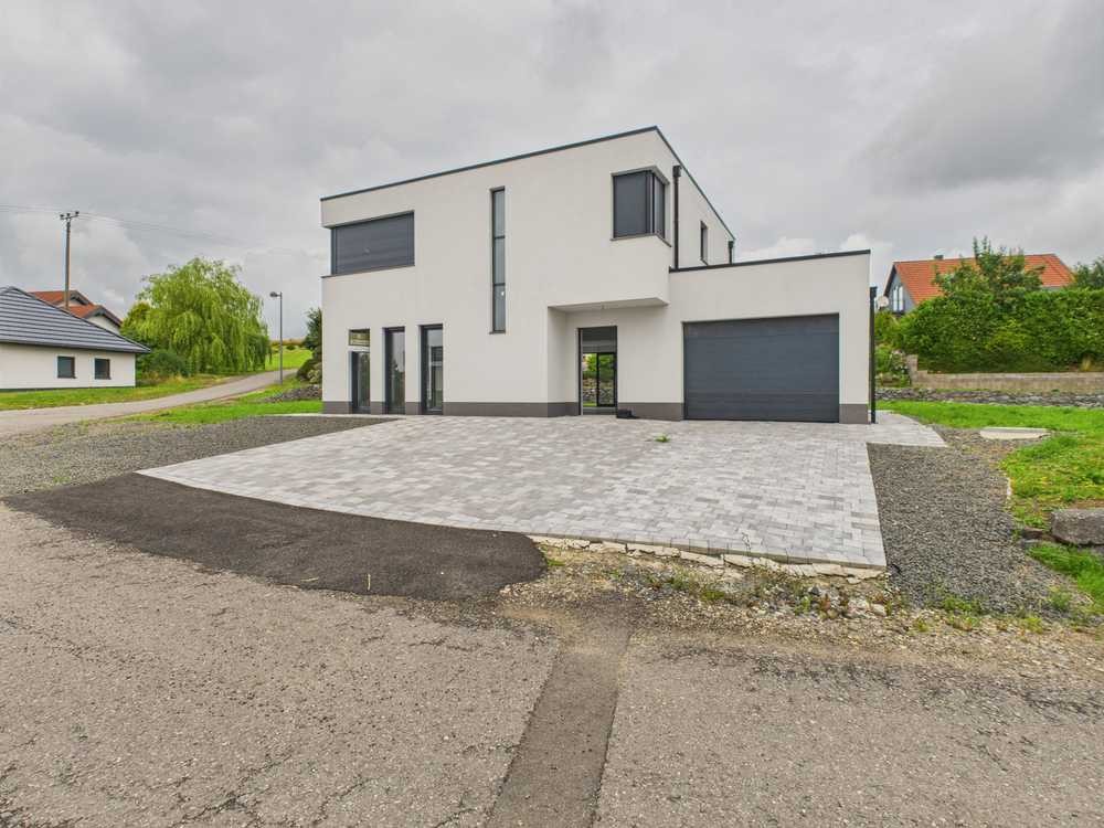 Die klare Architektur mit raffinierten Linien sorgt für ein zeitloses Erscheinungsbild, während der großzügige Garten, die gepflasterte Einfahrt und eine integrierte Garage zusätzlichen Komfort bieten. Dank der hochwertigen Bauausführung ist die Immobilie sofort bezugsbereit und eignet sich ideal für anspruchsvolles Wohnen in der naturnahen Vulkaneifel.