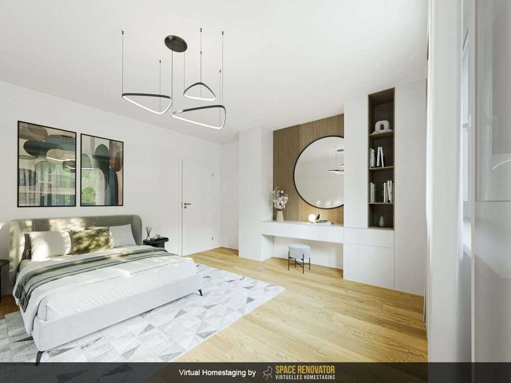 Das geräumige Schlafzimmer bietet ausreichend Platz für ein komfortables Bett, Stauraum und einen Schreibtisch, ideal für Studierende oder junge Berufstätige. Durch das große Fenster bleibt der Raum stets freundlich und hell.