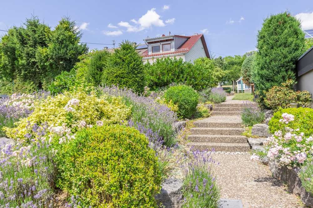 Das ca. 500 m² große Grundstück lädt mit seinem liebevoll angelegten Garten, einer Terrasse und ausreichend Freifläche zum Entspannen, Gärtnern oder Spielen ein.