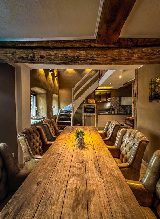 Das Haus erstreckt sich über drei Etagen, ergänzt durch zwei Kellergeschosse, darunter ein stilvoller Gewölbekeller, nur von außen zugänglich.