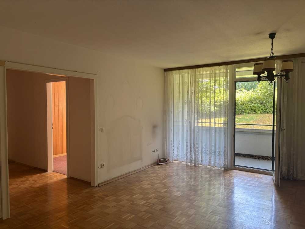 Helles Wohnzimmer mit bodentiefen Fenstern und Zugang zur Loggia