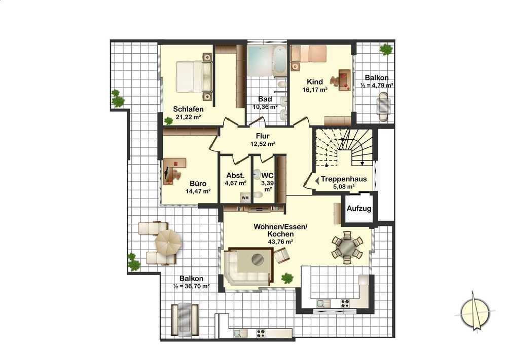 Die Penthousewohnung verfügt über 2 großzügige Terrassen, diese sind in Ost-, Süd- und Westrichtung ausgerichtet. Dadurch können Sie den ganzen Tag die Sonne geniesen.