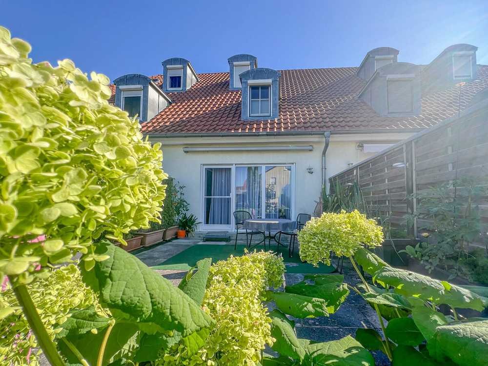 Im Erdgeschoss befindet sich das helle Wohn- und Esszimmer, das direkt an die separate Küche mit Einbauküche anschließt. Ein praktischer Einbauschrank im Flur sowie ein Gäste-WC ergänzen diesen Bereich. Vom Wohnzimmer aus gelangt man auf die sonnige Terrasse mit Markise, die einen kleinen Gartenanteil einschließt und zum Entspannen im Freien einlädt.