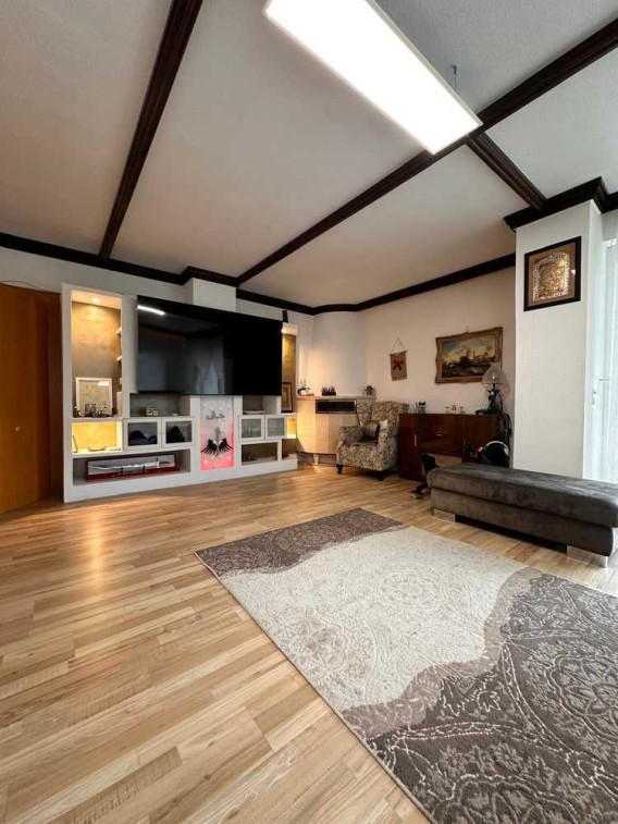 Das riesige Wohn- Esszimmer mit 56 m² und schönem Mittelkamin lässt keine Wünsche offen und die daneben liegende große Küche mit neuer Einbauküche lässt auch das Herz höher schlagen .