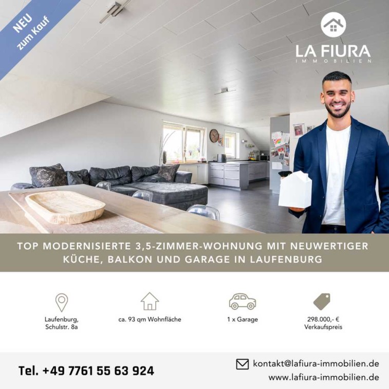 Zum Verkauf steht eine top modernisierte 3,5-Zimmer-Dachgeschosswohnung mit Balkon in ruhiger und familiärer Wohngegend von Laufenburg, Rhina. Das Angebot wird durch eine schöne Einbauküche sowie eine Garage komplettiert, beides bereits im Kaufpreis enthalten.