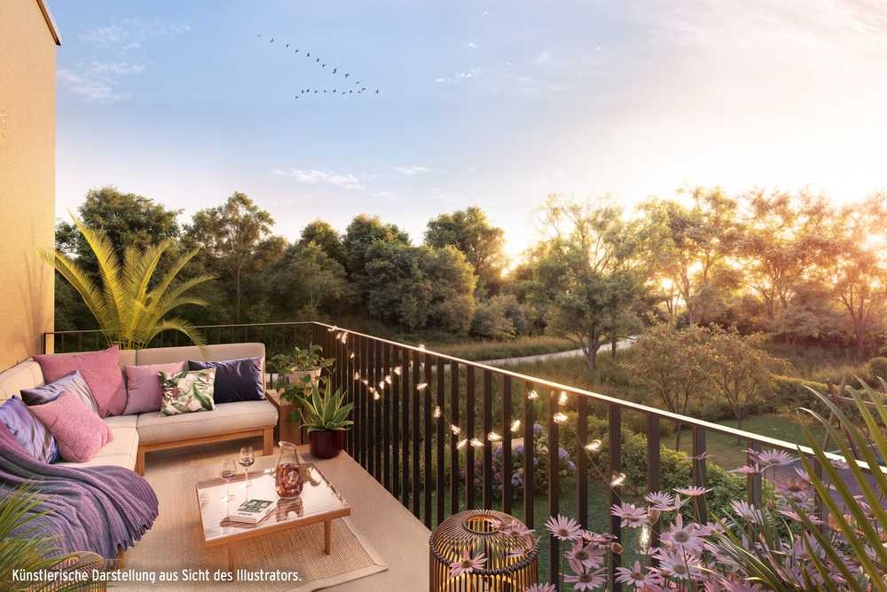 Im Mittelpunkt steht der großzügige Wohn-, Ess- und Kochbereich, der sich zum nach Südosten ausgerichteten Balkon öffnet. Hier lässt sich der Morgen bei einer Tasse Kaffee beginnen oder an warmen Tagen viel Zeit im Freien genießen.