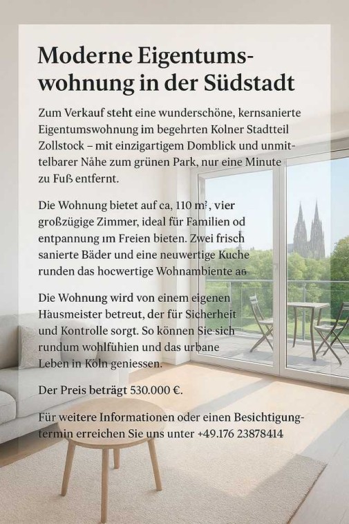 Diese großzügige und helle 4-Zimmer-Wohnung mit ca. 105 m² Wohnfläche befindet sich im 6. Obergeschoss eines gepflegten Wohnkomplexes aus den 70er-Jahren. Die Wohnung überzeugt durch ihre moderne Ausstattung, drei Balkone mit Wintergarten und eine hervorragende Lage im beliebten Kölner Süden. Dank des durchdachten Grundrisses eignet sich das Objekt ideal für Familien, Paare oder alle, die viel Platz und Komfort schätzen.