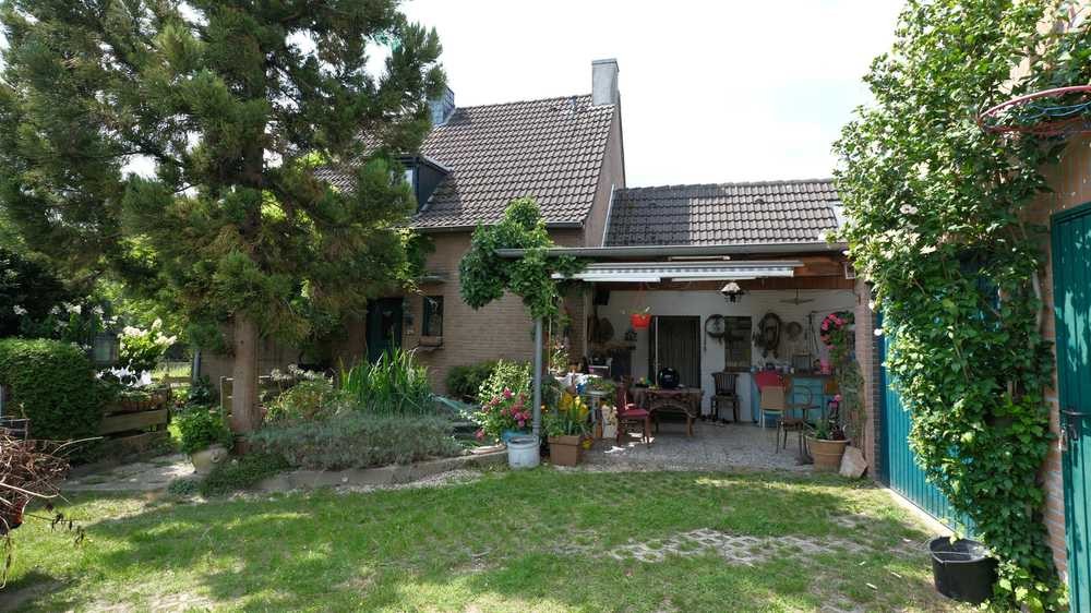 Freistehendes Ein- oder Zweifamilienhaus mit Garten und großer Doppelgarage.