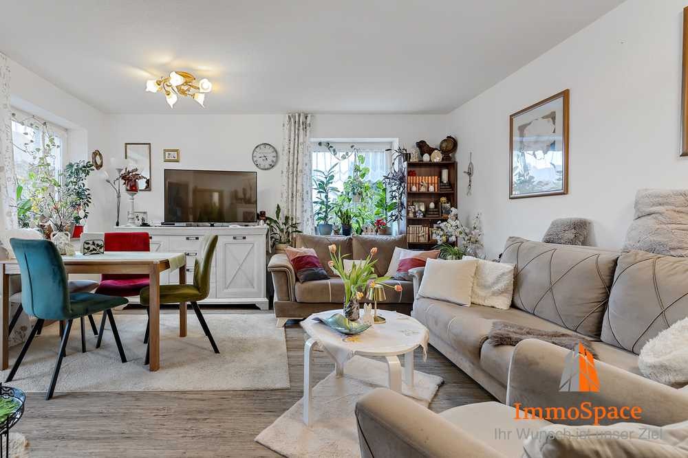 Der großzügig geschnittene Wohn- und Essbereich bildet das Herzstück der Wohnung. Große Fensterflächen sorgen hier für viel Tageslicht und eine angenehme Wohnatmosphäre.