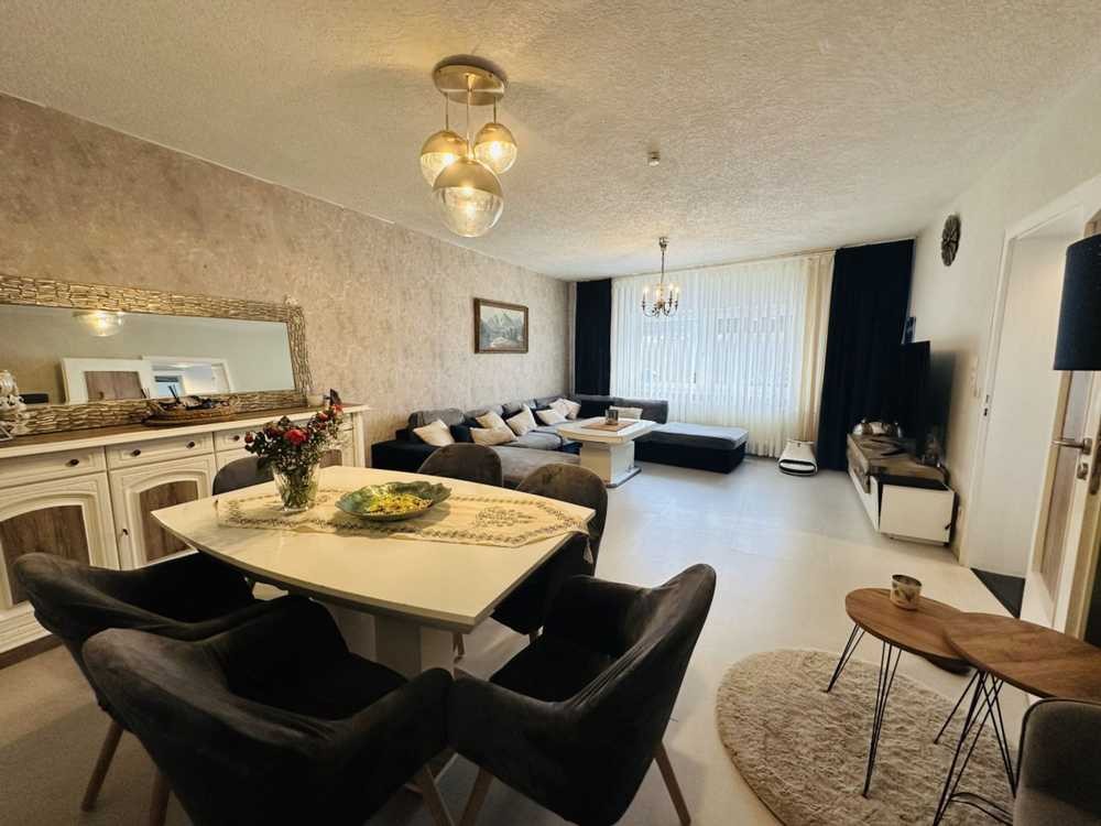 In der modernen und umfangreich renovierten Wohnung im Erdgeschoss befinden sich ein offener Wohn- und Essbereich, eine geschmackvoll eingerichtete Küche, ein Kinderzimmer, ein Abstellraum, ein Schlafzimmer und ein Bad mit Dusche. Die Wohnfläche beträgt ca. 80 m²