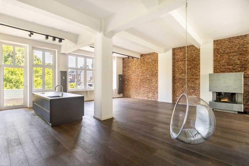 Mit einer Wohnfläche von ca. 166 m² bietet die Wohnung viel Platz und eine luftige Atmosphäre, die durch die hohen Decken von ca. 3,73 m und große Fensterflächen verstärkt wird. Der offene, lichtdurchflutete Wohn- und Essbereich erhält seinen typischen Loft-Charakter durch große Fensterelemente, breite Pfeiler und Stützen sowie einer offenen Backsteinwand. Große Eichendielen und der Holzkamin setzen warme Akzente. Die offene Küche schließt sich an und ist mit Einbauten von der Firma Next125 und Geräten von Bora und Siemens ausgestattet. Eine stilvolle maßgefertigte Stahl-Glas-Wand mit Flügeltür der Metallmanufaktur van de Weyer trennt einen weiteren Raum vom Wohnbereich ab, der gut als Büro oder Gästezimmer nutzbar ist. Das Schlafzimmer liegt daneben und verfügt über einen separaten, begehbaren Ankleidebereich. Das zeitlose Badezimmer ist mit einer Badewanne, Regendusche, WC und Fenstern zur Gartenseite ausgestattet. Ein weiteres Gäste-WC mit Waschmaschinenanschluss steht ebenfalls zur Verfügung. Der Balkon bietet einen überraschend ruhigen und schönen Ausblick ins Grüne der angrenzenden Gärten – ein reizvoller Kontrast zum quirligen Leben vorne an der Straße. Zur Wohnung gehört ein Außenstellplatz im Innenhof sowie ein Kellerraum.