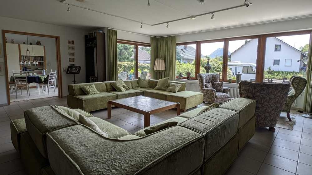 Im Erdgeschoss befinden sich ein großzügiges Wohnzimmer mit angrenzendem Kachelofenzimmer. Beide Räume haben einen direkten Zugang zur Terrasse – ideal für entspannte Stunden im Freien. Zudem gibt es ein Schlafzimmer mit eigenem Bad, eine Küche, ein Esszimmer und ein Gäste-WC.