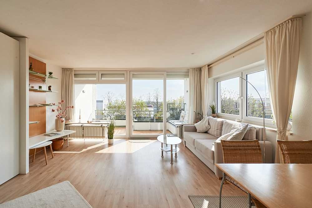 Über den Eingangsbereich der am Ende der obersten Etage gelegenen Wohnung gelangen Sie in den großen, geschmackvoll eingerichteten lichtdurchfluteten Wohn-/Schlafbereich, der mit seinen mehr als 28 m² und einer bodentiefen Panoramafensterfront mit Schiebe-Glastüranlage aus 2022 sowie den nach Westen ausgerichteten seitlichen Doppelfenstern brilliert. Hier ist Dank der nach Süd-Westen ausgerichteten Endwohnungslage im obersten Geschoss die Sonne bis in die Abendstunden zu Gast! Genießen Sie maximale Privacy!