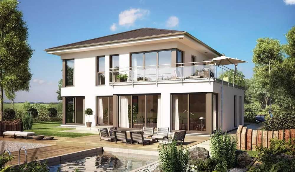 Diese repräsentative Villa lässt Wohnträume wahr werden. Schon das äußere Erscheinungsbild lässt erahnen, wie luxuriös und großzügig es im Innern zugeht. An den quadratischen Baukörper schließt sich ein Übereck-Erker im XXL-Format an, auf dessen Dach sich ein ausladender Balkon befindet. Die knapp 30 m² eröffnen einen großen Gestaltungsspielraum. Ausgestattet mit trendigen Hängesesseln und gemütlichen Sonnenliegen avanciert der Freisitz in luftiger Höhe rasch zum Lieblingsplatz der Bewohner. Umrahmt wird das Wohlfühlambiente von blühenden Kübel- und Topfpflanzen. Den oberen Abschluss des Fertighauses bildet ein elegantes Walmdach mit Dachüberstand und Kastengesims. Im Innern eröffnet sich auf fast 180 m² eine großzügige Wohnwelt für eine vierköpfige Familie. Gleich neben dem Eingang befindet sich der Garderobenbereich, wo Bewohner und Besucher ihre Schuhe und Jacken ablegen können. Wer sich kurz frisch machen möchte, kann sich in das angrenzende Gäste-WC zurückziehen. Eine repräsentative Diele führt in den lichtdurchfluteten Wohn-, Ess- und Kochbereich, der mit einem interessanten und gleichzeitig sehr funktionalen Schnitt aufwartet. Die rechte Seite bietet sich für eine großzügige Couchlandschaft an. Der Platz im Erker lässt sich wunderbar für eine lange Tafel nutzen, an der auch mehr als sechs Personen bequem speisen können. Nahtlos schließt sich die Küche an den Essbereich an, in der sich auch mehrere Hobbyköche nicht in die Quere kommen: Während am Küchenblock fleißig geschnippelt und gebraten wird, kann an der klassischen Küchenzeile entlang der Wand bereits das erste Geschirr gespült werden. Die Gäste werden sich bestimmt fragen, was sich hinter den eleganten Schiebetüren neben dem Esstisch verbirgt. Die Antwort ist einfach: Hier liegt ein schickes Büro mit malerischem Blick ins Grüne. Komplettiert wird das Raumangebot im Erdgeschoss von einem Technik- und Hauswirtschaftsraum. Unter dem Dach befinden sich zwei große Kinderzimmer, ein Schlafzimmer mit integriertem Ankleidebereich und ein Wellnessbad mit Wanne und Dusche.