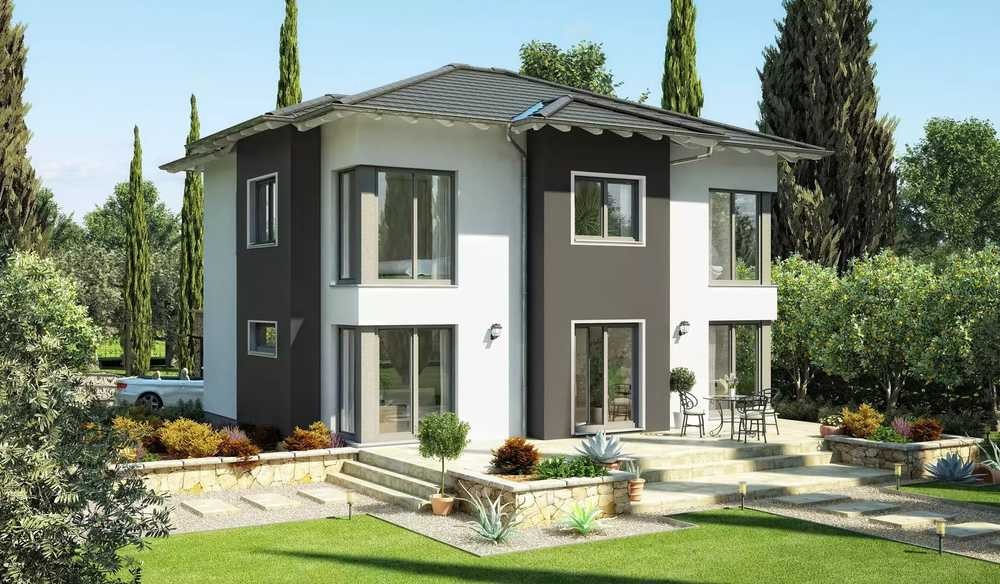 Diese luxuriöse Stadtvilla zieht mit ihrem ausdrucksstarken Hell-Dunkel-Kontrast alle Blicke auf sich. Während sich der Hauptbaukörper in einen strahlend weißen Mineralputz hüllt, zeigen sich die beiden Querhäuser in einem erhabenen Grauton. Für Spannung sorgen zudem die formschönen Fensterpartien auf beiden Ebenen, die von schlanken Lichtbändern bis hin zu bodentiefen Übereck-Verglasungen reichen. Ein schönes Detail sind die weißen Faschen - die Umrahmungen der Lichtöffnungen in beiden Architektur-Bauteilen. Den oberen Abschluss des Gebäudes bildet - wie es sich für eine stilvolle Stadtvilla gehört - ein flach geneigtes Walmdach. Im Innern des Fertighauses stehen den zukünftigen Bewohnern zwei Vollgeschosse mit einer Wohnfläche von insgesamt 170 m² zur Verfügung, die sie nach Belieben gestalten können. In Eingangsnähe wurden die Funktionsräume angeordnet. Sie bestehen aus einem Gäste-WC, einer Garderobe und dem Technik- bzw. Hauswirtschaftsraum. Letzterer beherbergt nicht nur die gesamte Haus- und Heiztechnik, sondern bietet auf rund 9 m² auch genügend Abstellfläche für all die Dinge, die nicht jeden Tag gebraucht werden. Die Diele mündet in einen Flur, der fließend in die Gemeinschaftsräume übergeht. Die L-förmige Anordnung sorgt für eine optische Abgrenzung der einzelnen Funktionsbereiche. Besonders praktisch: Die Küche besitzt einen eigenen Zugang zum Flur. So kann sie zweizeilig oder auch in U-Form gestaltet werden, ohne dass sich die Bewohner dadurch den Weg abschneiden. Vor der raffinierten Übereck-Verglasung findet der Esstisch Platz, von dem sich ein malerischer Ausblick ins Grüne ergibt. Die gegenüberliegende Seite ist für die Couch reserviert, die um ein oder mehrere Sessel ergänzt werden kann. Zum Lieblingsplatz avanciert sicherlich das luftige Querhaus. Das Obergeschoss ist perfekt auf die Bedürfnisse einer vierköpfigen Familie abgestimmt. Es teilt sich in zwei Trakte: den Bereich der Kinder mit zwei großen Schlafzimmern und einem eigenen Kinderbad sowie den Elternbereich, der aus einem hellen Schlafzimmer inklusive Ankleide und einem Wellnessbad besteht.