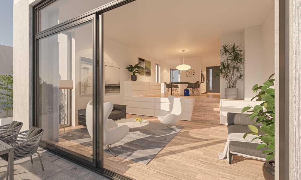 Die moderne Architektur und das Wohnen auf versetzten Wohnebenen verspricht ein exklusives Wohnflair. Große Fensterflächen sorgen für viel Licht in den Räumen.