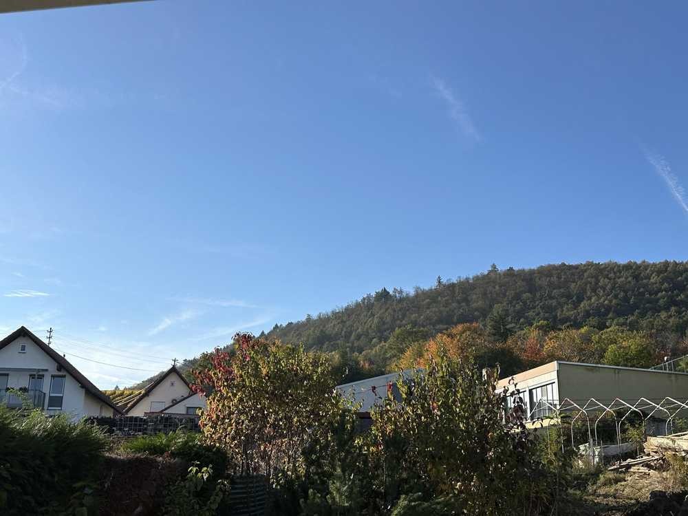 Hinterm Haus befindet sich der ca. 150qm große leicht ansteigende quadratische Garten aus welchem man Richtung Pfälzer Wald schaut und Abends die Sonne untergehen sehen kann.