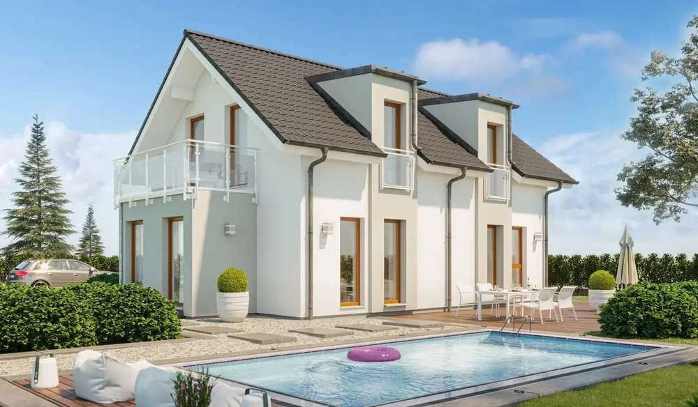 Sanft weht der Sommerwind über Wiesen und Felder und bringt die goldenen Ähren zum Tanzen. In der Luft liegt der Geruch von Heu, Blüten und Beeren. Was passt besser in dieses Szenario als ein romantisches Landhaus wie dieses? Der Entwurf begeistert mit seiner Mischung aus modernen und traditionellen Elementen. Der Baukörper wird erweitert von einem zweigeschossigen Giebelerker, der sich unter die weiten Dachüberstände schiebt, sowie einem großzügig verglasten Querhaus mit Satteldach. Prägnant ist die Holzverschalung am Dachgeschoss, die dem Haus eine alpenländische Note verleiht. Betreten wird es über die Traufseite. Jetzt heißt es erst einmal tief durchatmen - und das aus zwei Gründen: Zum einen wegen des angenehmen Raumklimas, das im Innern herrscht. Jedes Bien-Zenker Haus wird aus wohngesunden Materialien errichtet - allen voran der Naturbaustoff Holz, der die Feuchtigkeit auf positive Weise reguliert. Zum anderen aber auch wegen der beeindruckenden Weite. Schon die Diele überrascht mit ihrem luftig-leichten Ambiente. Unter der viertelgewendelten Treppe ist genügend Platz für einen Garderobenschrank, einen großen Spiegel und eine gemütliche Sitzbank, die das An- und Ausziehen der Schuhe erleichtert. Rechts an die Diele schließen sich der Technikraum, ein Schlafzimmer bzw. Homeoffice und ein Bad mit Dusche an. Links der Diele gelangt man direkt in die Küche, die alles bietet, was sich ein Hobbykoch wünscht. Sogar eine Theke lässt sich einbauen. Gegessen und entspannt wird im Wohn- und Essbereich, der über bodentiefe Fenster mit Tageslicht geflutet wird. Ebenso hell und luftig wie das Erdgeschoss präsentiert sich die obere Etage. Dank der flachen Dachneigung setzen die Schrägen erst bei einer Höhe von 1,60 m an. Darunter bleibt ausreichend Stellfläche für Kommoden, Schreibtische und Betten. Zwei große Zimmer mit Blick ins Grüne lassen die Herzen der Kinder höherschlagen. Für die Eltern steht ein schönes Schlafzimmer mit heller Ankleide bereit. Abgerundet wird das Raumangebot von einem gemütlichen Familienbad.