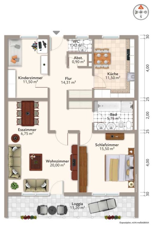 Die Wohnung hat ein Kinderzimmer, ein Wohnzimmer mit Esszimmer und Balkon, ein Schlafzimmer, ein Bad mit Badewanne (Dusche), eine Küche mit Essbereich, ein Abstellraum, einen großen Flur und ein Gäste-WC.