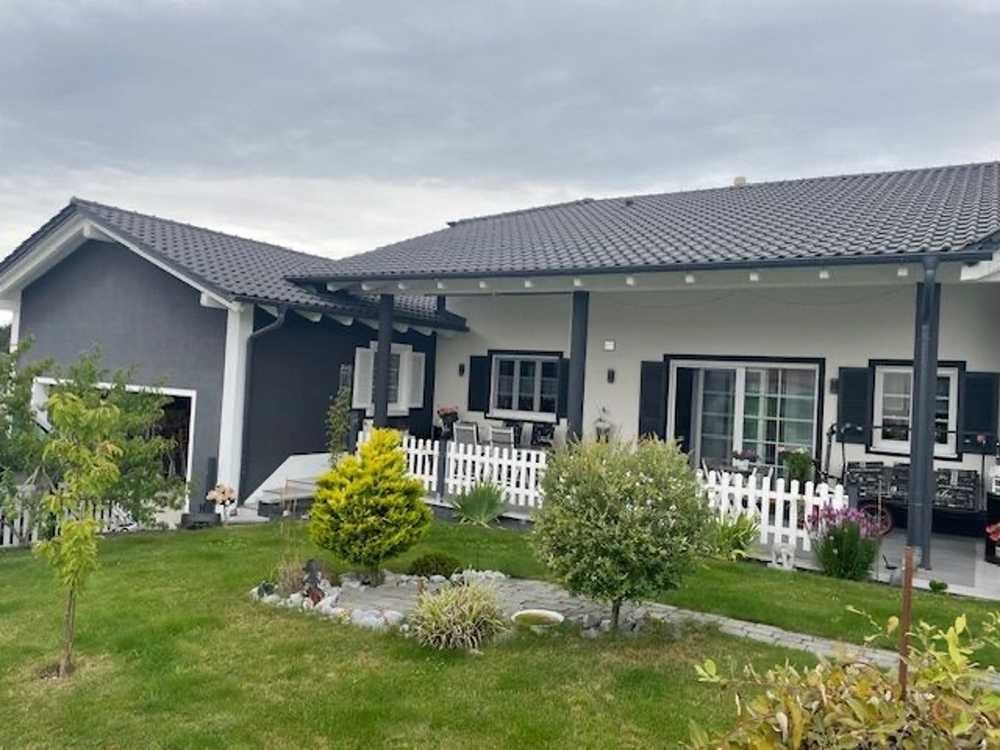 Willkommen in Ihrem modernen, energieeffizienten und hochwertigen neuen Zuhause. Dieser 2020 im amerikanischen Baustil in Massivbauweise erbaute Bungalow mit großzügigen überdachten Veranden, offener Raumgestaltung sowie einem großzügigen Wohnbereich, großem Schlafzimmer und Masterbad ist ein absolutes Highlight und eine Seltenheit und bietet sämtlichen Komfort. Das ca. 647 m² große, sonnige Grundstück in herrlicher Südlage erstreckt sich anteilig um das Gebäude herum und wurde liebevoll von den Eigentümern angelegt. Über einen geräumigen Windfang, welcher genügend Platz für eine Garderobe bietet betreten Sie die Wohnung. Durch eine Doppelflügeltüre betreten Sie das großzügige Wohnzimmer mit Kamin, welcher für Gemütlichkeit sorgt. Hier sorgen großzügige Fensterfronten für reichlich Tageslicht. Vom Wohnzimmer haben Sie Zugang auf die überdachte ca. 40 m² Terrasse und in den Garten. Die Wohnküche, welche Sie über einen breiten Durchgang vom Wohnzimmer aus erreichen verfügt über eine hochwertige Einbauküche mit Elektrogeräte der Marken Küppersbusch und Siemens und bietet sämtlichen Komfort. Eine Kücheninsel mit Sitzgelegenheiten schafft reichlich Platz und lädt zum gemütlichen Beisammenseins ein. Für reichlich Stauraum sorgt eine Speisekammer, welche sich direkt neben der Küche befindet. Von der Küche aus können Sie direkt eine weitere, ca. 40 m² großen Westterrasse sowie den Garten betreten. Von hier genießen Sie einen herrlichen Ausblick und es lässt sich die Abendsonne bei einem Gläschen Wein genießen. Über den breiten Flur erreichen Sie das großzügige Schlafzimmer. Das Masterbad verfügt ebenfalls über ein Fenster. Hier bietet sich reichlich Platz und eine Wellnessoase mit großzügiger Eckbadewanne in der Sie die Seele baumeln lassen können. Durch eine Wand separiert befindet sich die bodentiefe Dusche sowie die Toilette und der Waschmaschinenanschluss. Ein weiterer Raum mit Fenster sowie ein Gästebad mit Fenster, Toilette und Dusche runden das Platzangebot ab. Im gesamten Haus wurden hochwertige Materialien verbaut. Typisch für diesen Baustil erstreckt sich die überdachte Hauptterrasse in herrlicher Südausrichtung über die gesamte Länge und bieten reichlich Platz mit ca. 40 m². Es wurden 20 m² zur Wohnfläche gerechnet. Von der ca 45 m² große Doppelgarage mit elektrischem Rolltor mit 2 Stellplätzen davor haben Sie direkten Zugang in die Küche. Das Dachgeschoss bietet Ausbaupotenzial, was eine zusätzliche Fläche von ca. 50 m² ergeben würde. Eine Regenwasserzisterne sorgt für reichlich Wasserreserve, welches zur Bewässerung des Gartens genutzt werden kann. Hier stehen Anschlüsse um das Haus zur Verfügung. Ihre Bungalow-Doppelhaushälfte wird mit einer Luftwärmepumpe des Herstellers Viessmann beheizt welche die Fußbodenheizung mit Wärme versorgt. Sämtliche Fenster und Türen sind 3-fach verglast (+ Fliegengitter) und verfügen über Jalousien, welche an den Türen elektrisch betätigt werden können. Der liebevoll angelegte Garten lädt zum Verweilen ein. Hier lassen sich ungestörte Stunden im Freien genießen. Der Energieausweis liegt zur Besichtigung vor.