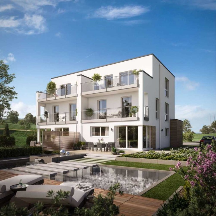 In schlichter Eleganz präsentiert sich dieses dreigeschossige Doppelhaus mit Flachdach. Positiv ins Auge stechen vor allem die attraktiven Balkone, die über einem großzügig verglasten Wintergarten-Erker thronen. Dank der filigranen Glasbrüstung eröffnet sich von jedem Winkel aus ein malerischer Ausblick über die Umgebung. Damit auch beim Relaxen unter freiem Himmel die Privatsphäre gewahrt bleibt, wurden zwischen die beiden Haushälften Trennwände gesetzt. Auf der Eingangsseite des Fertighauses wurde ein Übereck-Erker angedockt, der sich mit seiner attraktiven Holzverschalung von der strahlend weißen Mineralputzfassade des Haupthauses abhebt. Er erweitert die Wohnfläche im Innern um einen geräumigen Garderobenbereich mit angrenzendem Gäste-WC. So bleibt die Diele als Verkehrsweg frei von Jacken, Taschen oder Schuhen, die als Stolperfallen fungieren könnten. Rechts an die Diele schließt sich ein Technik- bzw. Hauswirtschaftsraum an, der zusätzliche Stellfläche für all die Dinge bietet, die man nicht täglich braucht. Den größten Teil des Erdgeschosses nimmt der offen angelegte Wohn-, Ess- und Kochbereich ein, der knapp 50 m² misst. Harmonisch fügt sich die halbgewendelte Treppe in die Gemeinschaftsbereiche ein. Eine Trennwand zum Wohnzimmer sorgt dafür, dass der gemütliche Fernsehabend nicht vom "Durchgangsverkehr" gestört wird. Das erste Obergeschoss ist für den Nachwuchs reserviert. Die beiden Kinderzimmer bieten für jedes Alter viel Bewegungsfreiraum. Für Übernachtungsgäste steht ein weiterer Raum bereit. Letzterer lässt sich natürlich auch als drittes Kinderzimmer, als Hobbyraum oder auch als Musikzimmer nutzen - Flexibilität wird in einem Familienhaus heute großgeschrieben. Komplettiert wird das Wohlfühlambiente von einem Kinderbad mit Dusche und WC. Das zweite Obergeschoss haben die Eltern ganz für sich allein. Über eine luftige Empore wird das Schlafzimmer betreten, das über bodentiefe Fenstertüren mit Licht geflutet wird. Der vorgelagerte Bereich bietet sich für einen Schreibtisch, einen großen Schminktisch oder auch für einen gemütlichen Relaxsessel an. An das Schlafzimmer schließen sich ein geräumiger Ankleidebereich sowie ein Wellnessbad an.