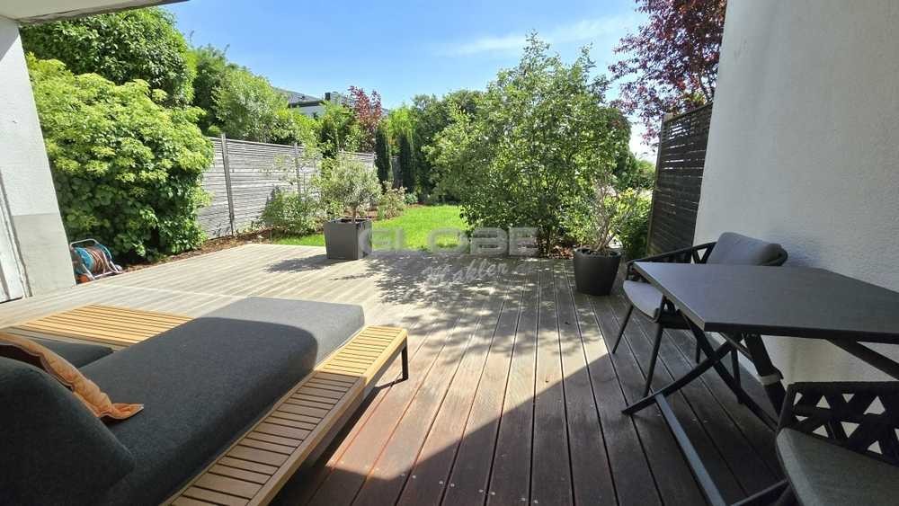 Genießen Sie aus beiden sonnenverwöhnten Etagen zu jeder Zeit einen wunderschönen Blick in Ihren erst jüngst neu und hübsch angelegten Garten sowie von Ihrer reizvollen Balkon-Loggia darüberhinaus den herrlich unverbaubaren, weitläufigen Fernblick.