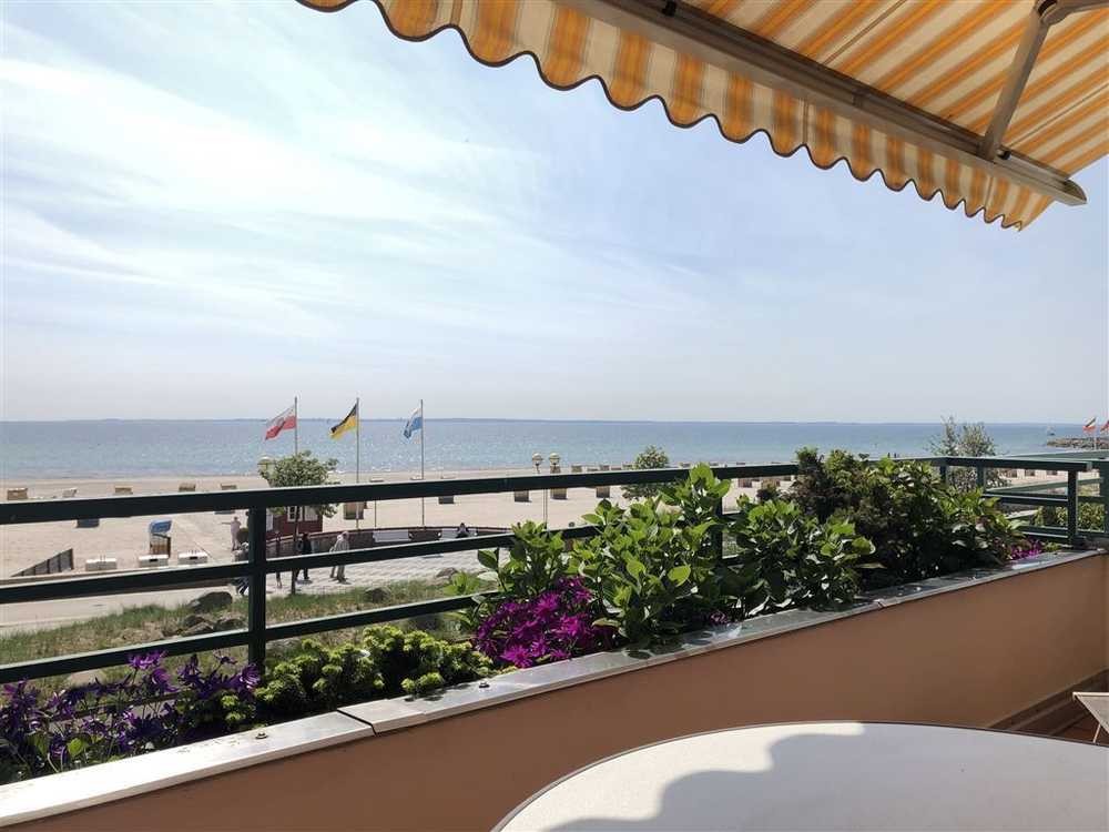 Die bodentiefe Fensterfront mit Schiebe-Glastüranlage gibt den direkten Blick auf den Strand und die Ostsee frei. Der großzügige Balkon ist uneinsehbar und erweitert die Wohnung zu einer Oase.