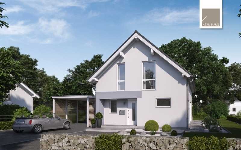 Architektenhaus Lou von Kern-Haus mit rund 97 Quadratmetern Wohnfläche und Satteldach bietet im Erdgeschoss unter anderem einen offen gestalteten Wohn- und Essbereich mit angrenzender Küche. Lichtdurchflutet wird der Raum durch bodentiefe Fensterelemente zum Garten. Komplettiert wird das Erdgeschoss durch den Hauswirtschaftsraum.