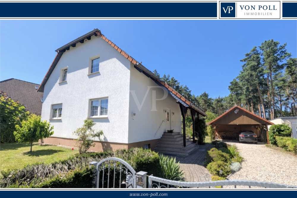 Im Außenbereich erwartet Sie ein echtes Naturparadies: ein gepflegtes Grundstück mit idyllischem Teich, hochwertigen Anpflanzungen und viel Platz zur Erholung. Ein Doppelcarport ermöglicht das Parken zweier PKW's auf dem Grundstück.