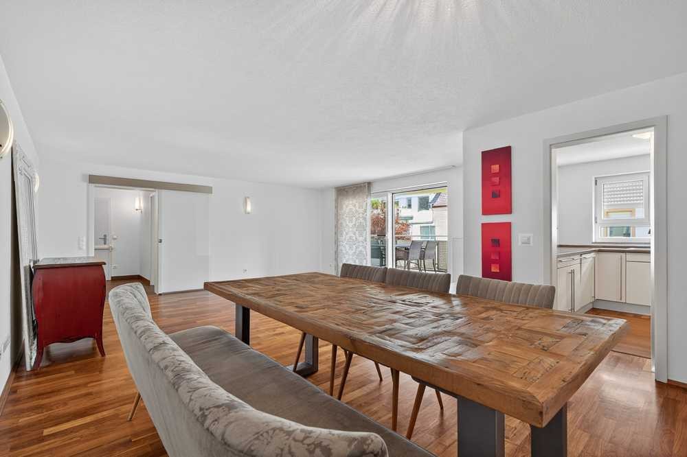 Der Grundriss ist klar und großzügig strukturiert: Mittelpunkt bildet der rund 37 m² große Wohn-/Essbereich mit Zugang zum rückwärtigen Westbalkon in den grünen Innenhof. Drei weitere Zimmer bieten Platz für Schlafen, HomeOffice oder Ihre Hobbys. Die Küche ist separat gehalten, lässt sich bei Bedarf aber zum Wohnbereich öffnen, um dem heutigen Wunsch nach offenem Wohnen Rechnung zu tragen. Ein geräumiges Tageslichtbad sowie ein separates Gäste-WC sorgen für Komfort, eine innenliegende Abstellkammer ergänzt den Kellerraum im Untergeschoss praktisch.