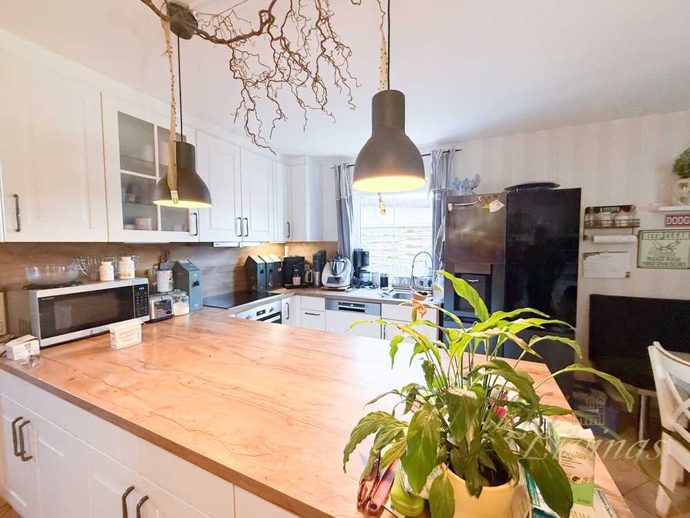 Der helle Eingangsbereich führt in den offen gestalteten Wohn- und Essbereich mit direktem Zugang zur Terrasse und in den Garten. Die moderne Einbauküche verfügt ebenfalls über einen praktischen Ausgang zur Terrasse. Ein separates Arbeitszimmer rundet das Raumangebot im Erdgeschoss ab.