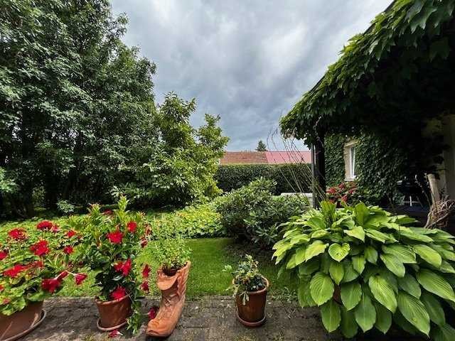 Liebevoll angelegter Garten mit gepflegten Grünflächen
