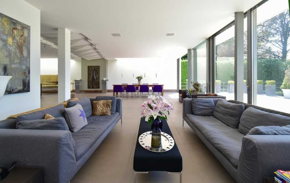 Sobald man das Innere dieser besonderen Immobilie betritt, überzeugen nicht nur hochwertige Naturmaterialien wie z.B. indische Sandsteinböden, die mit den weißen Wänden und beeindruckenden Glasflächen kontrastieren, sondern auch die außergewöhnlichen Raumhöhen von ca. 3 Metern, die ein unvergleichbares Raumgefühl und einzigartiges Wohnambiente schaffen .