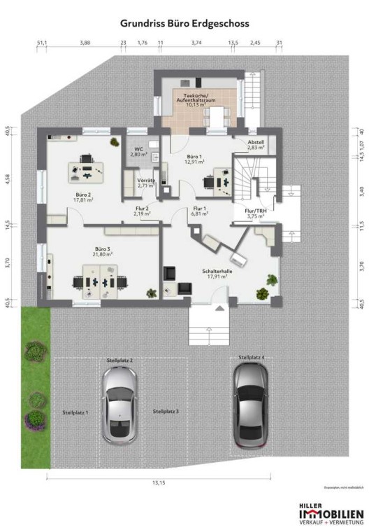 Die Einheit besteht aus großzügigen, hellen Räumen mit flexibler Aufteilung, einem praktischen Abstellraum, sanitären Anlagen und zwei zugehörigen Außenstellplätzen. Durch die bodentiefen Fensterfronten entsteht ein einladendes, offenes Raumgefühl – ideal für Büro, Praxis oder Dienstleistungsgewerbe.