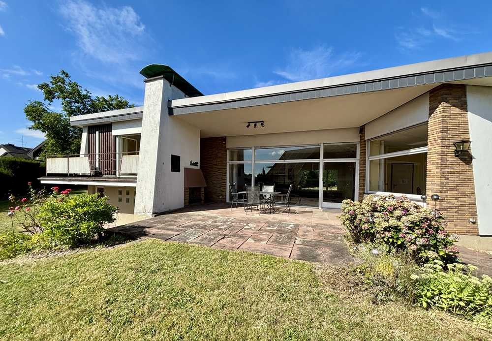 Zwei großzügige, ebenerdige Terrassen – eine davon mit offenem Kamin – laden zum Verweilen im Grünen ein. Die klare Formensprache, das flache Dach und die offene Grundrissgestaltung schaffen ein Wohnambiente mit Charakter und Geschichte.